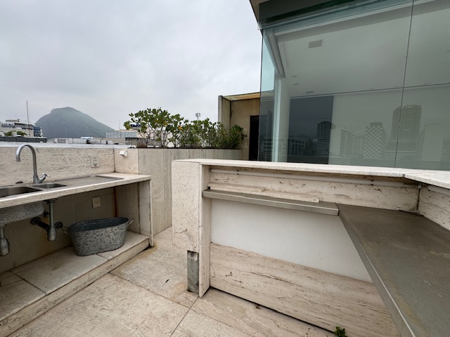 Espetacular cobertura duplex em Ipanema , vista lateral mar Lagoa e montanhas , 450m2 , com acesso aos 2 andares por elevador . 1o piso : Salão com marcenaria impecável , varandão , lavabo , 3 quartos sendo 2 suites com walk-in closets , copa , cozinha ,área de serviço com 3 quartos de empregada com um banheiro de serviço . 2º piso: Cobertura com amplo salão , terraço , churrasqueira e suporte , piscina e cozinha com escada interna de acesso para o piso inferior . Portaria 24h, 3 vagas de garagem .
